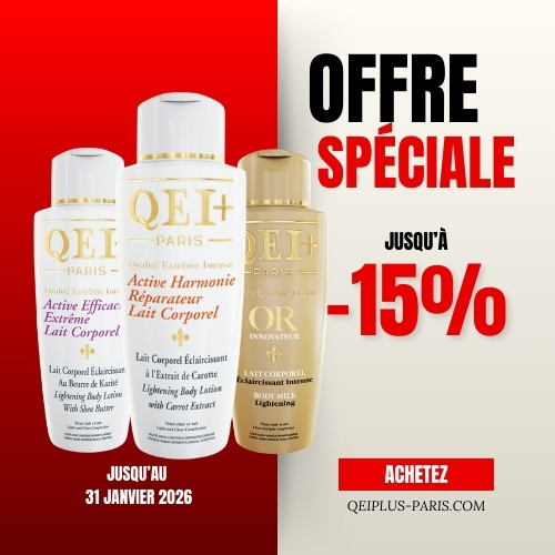 Découvrez la collection complète des meilleurs produits eclaircissants QEI+ Paris dans nos différentes gammes de soins cosmétiques adaptés aux peaux noires, mates et métissées : lait corps éclaircissant, sérum éclaircissant, savon éclaircissant gommant, glycérine éclaircissante, crème éclaircissante, gel éclaircissant, pommade éclaircissante, lotion tonique, gel douche clarifiant, gel nettoyant visage... pour un teint clair, unifié et lumineux !